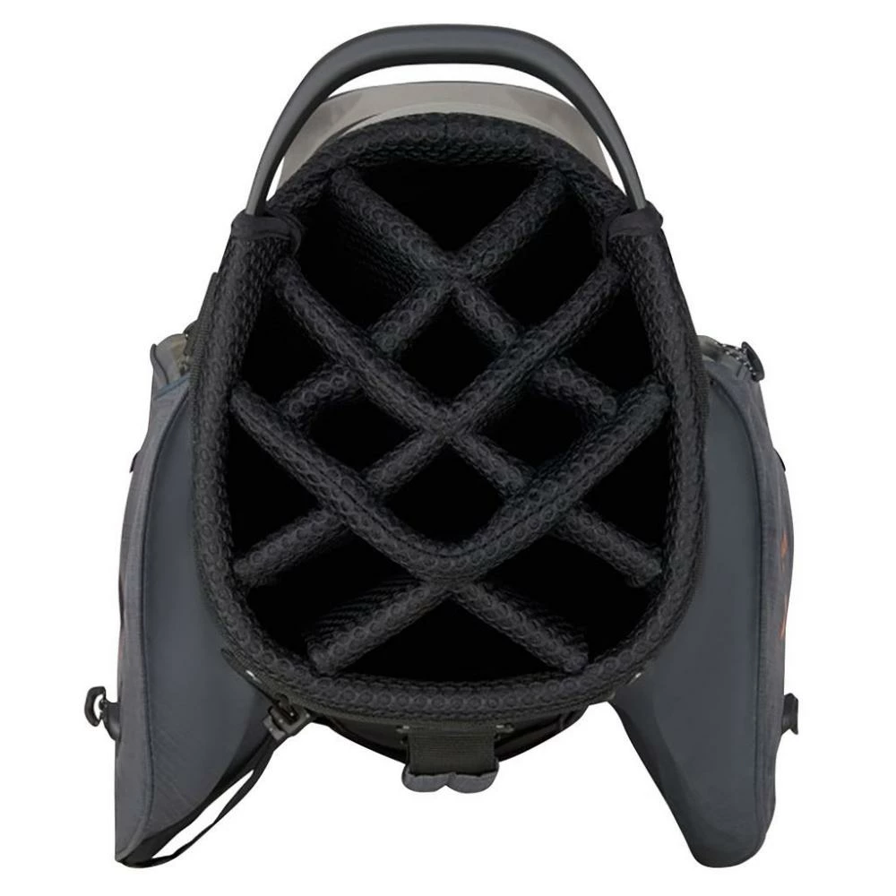 The top cuff of the Wilson Staff Dry Tech II cart bag has a 14-way top of which 3 are full length to help separate and organise your clubs better and easier. To store your putter Wilson Staff have used an external oversized putter well and to make the bag easier to load and unload on to whatever means of transport is your preference to top cuff has three moulded grab handles. Wilson Staff have used a trolley anchor base unit to ensure that the Dry Tech II cart bag fits securely on to the majority of trolleys and helps to reduce the twisting of the bag while going over all the all terrain on the golf course.Features: