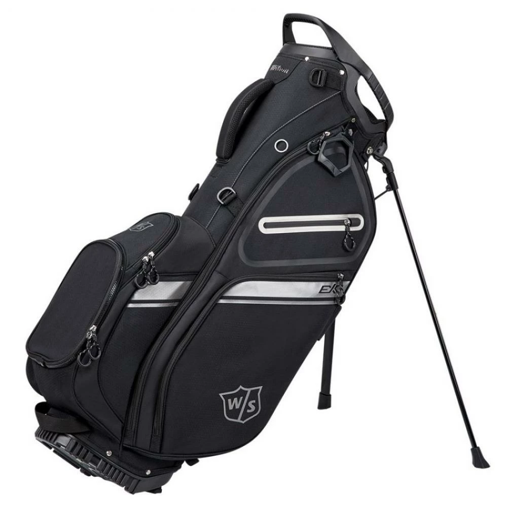 Wilson Staff EXO II stand bags deliver stunning looks in a premium format convenience, function and design: generous ball pockets, velour pockets for valuables, waterproof pockets for mobile phones and electronics- even insulated pockets for your favorite beverages. Wilson Staff have designed large 5-way top that has two full-length dividers to provide exceptional club management and very little clutter. The top cuff design also incorporates three grab handles that will make lifting and loading much easier. The EXO stand mechanism allows the base of the bag to stay flat on the ground when activated for the best possible stability in all conditions.