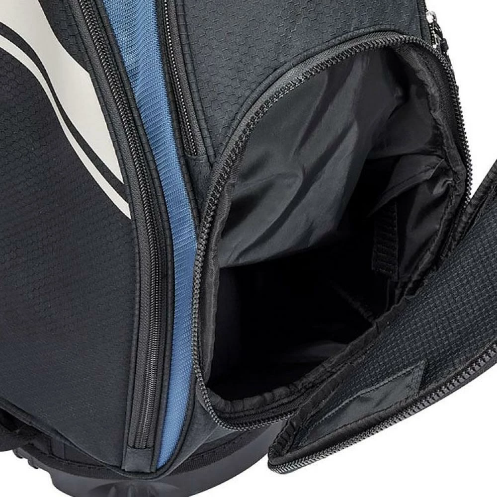 GREAT NEW BAG FOR 2021. Wilson Staff Exo II cart bags deliver convenience, function and design: generous ball pockets, velour pockets for valuables, waterproof pockets for mobile phones and electronics- even insulated pockets for your favorite beverages. Features and benefits of The EXO bag features a 14 way divider top with 14 full length dividers, enlarged putter section for thicker grips and a range of 7 pockets. The pockets include a Dry Tech valuables pocket to keep you belongings dry along with a large cooler pocket for your food and drinks. Integrated grab handles make lifting and loading much easier. To ensure a secure fit on a trolley or buggy the Exo cart bag features a trolley anchor base and a pass through cart channel at the top end of the golf bag.